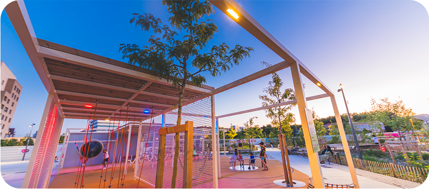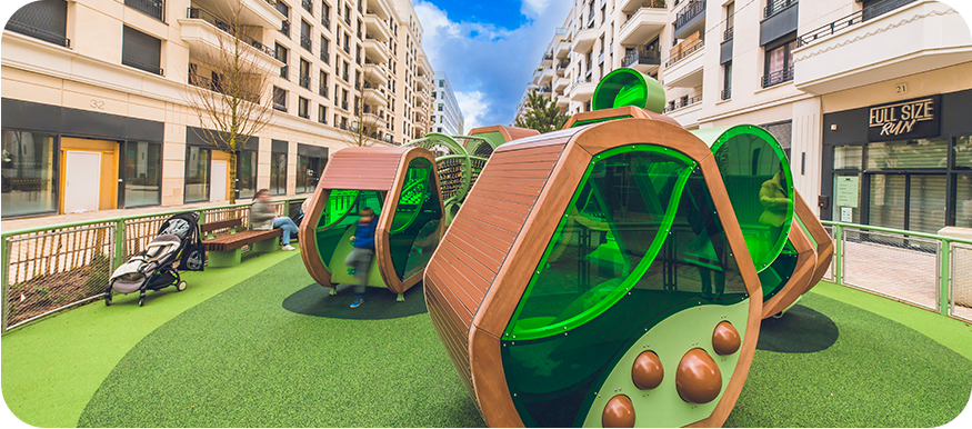 L'idée de ce projet d'envergure, redynamiser le Cours des Lavandières. Un nouveau lieu de vie se créé : habitations, commerces, de vrais lieux d'échanges émergent. Le maître d'ouvrage Sequano, conscient de la nécessité de redynamiser le Cours des Lavandières, a exprimé le besoin d'une aire de jeux colorée et attrayante. Pour ce projet le souhait s'est porté vers des structures en métal pour faciliter l'entretien, tout en insistant sur l'importance de la transparence dans le design.