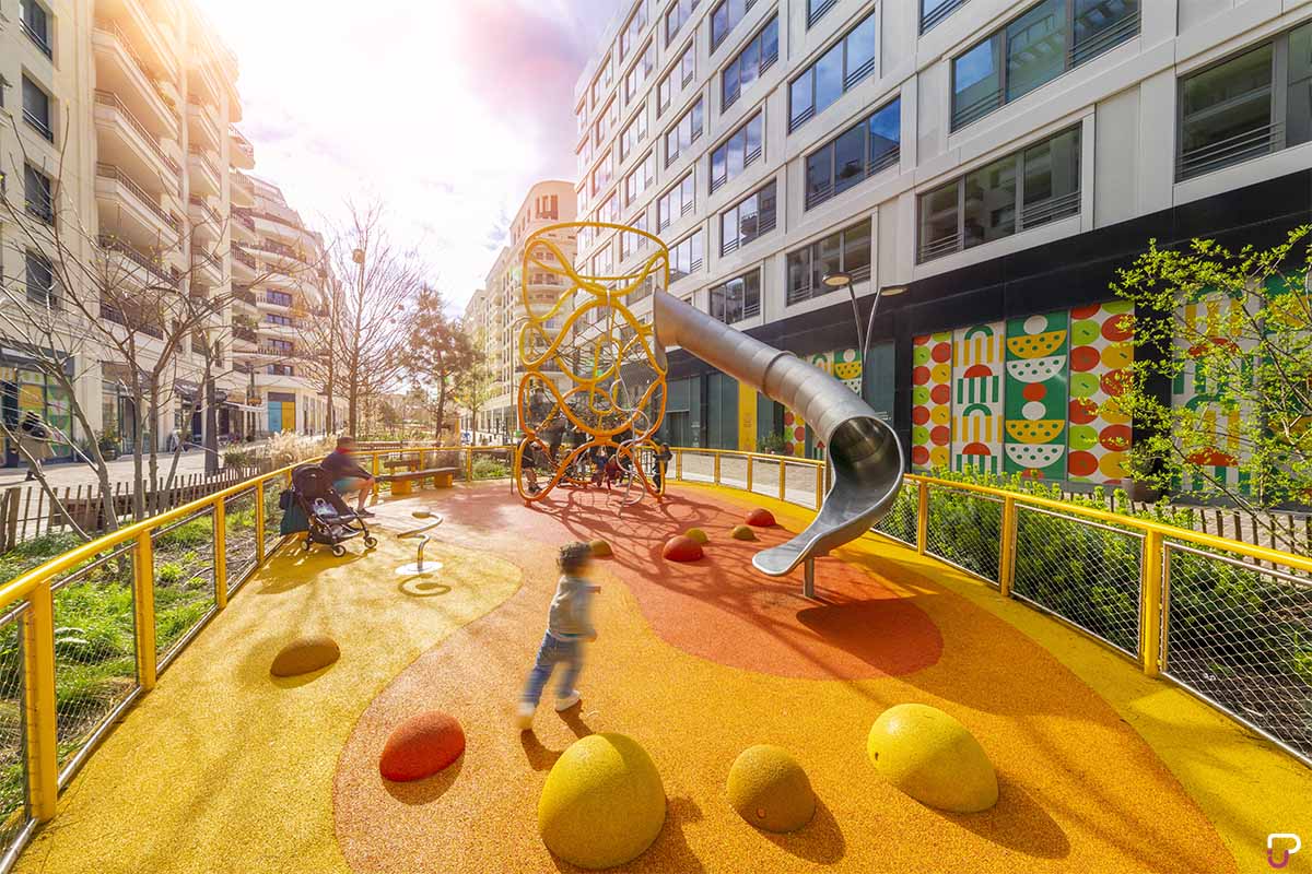 Le maître d'ouvrage Sequano, conscient de la nécessité de redynamiser le Cours des Lavandières, a exprimé le besoin d'une aire de jeux colorée et attrayante. Pour ce projet le souhait s'est porté vers des structures en métal pour faciliter l'entretien, tout en insistant sur l'importance de la transparence dans le design.