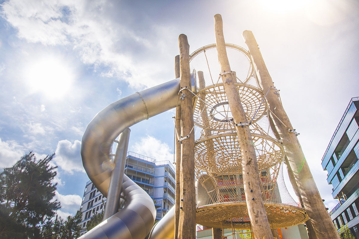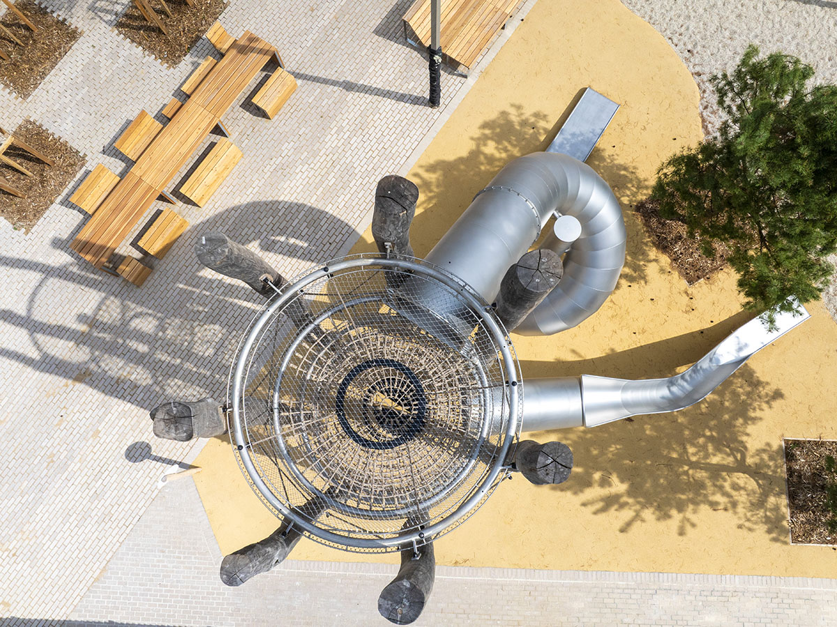 Autour de la tour, l’aire de jeux a été pensée pour offrir une grande variété d’usages et s’adapter à plusieurs tranches d’âge.