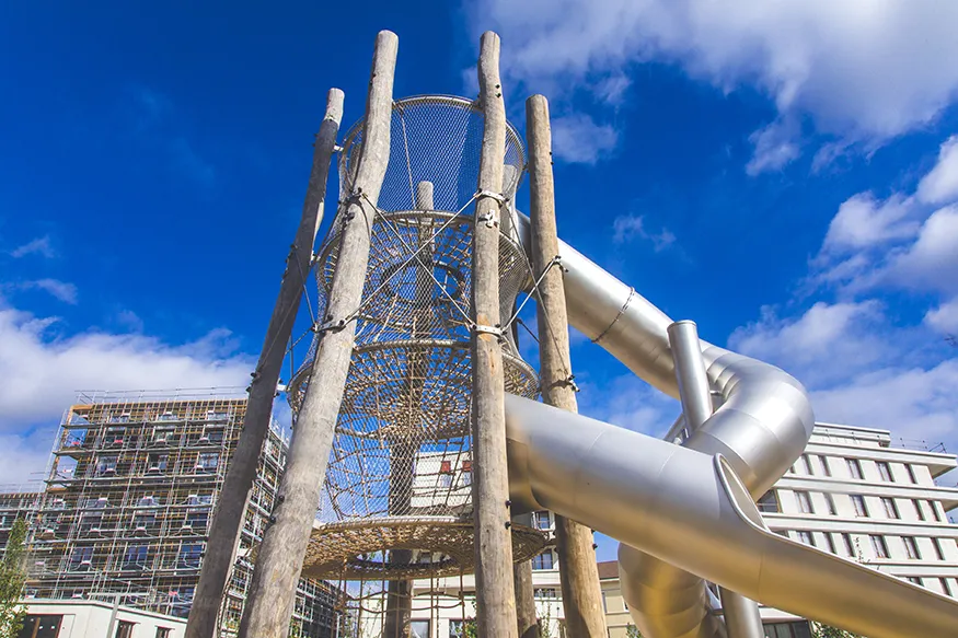 Autour de la tour, l’aire de jeux a été pensée pour offrir une grande variété d’usages et s’adapter à plusieurs tranches d’âge.