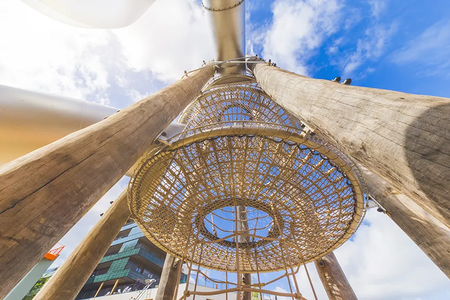 Au cœur de l’aire de jeux, une structure emblématique attire immédiatement le regard : une grande tour transparente en bois et en cordage, conçue sur-mesure et fabriquée en France.