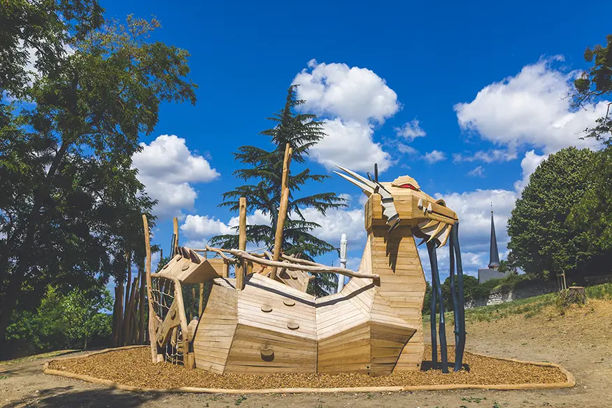 Au cœur de Saumur, ville emblématique du Val de Loire et fière de son patrimoine, un nouveau lieu dédié aux familles a vu le jour : le Square du Dragon. Installé au pied du célèbre Château de Saumur, cet espace ludique thématisé illustre parfaitement la volonté de la collectivité de réinventer l’espace public en créant des expériences qui font dialoguer histoire, imagination et plaisir du jeu.