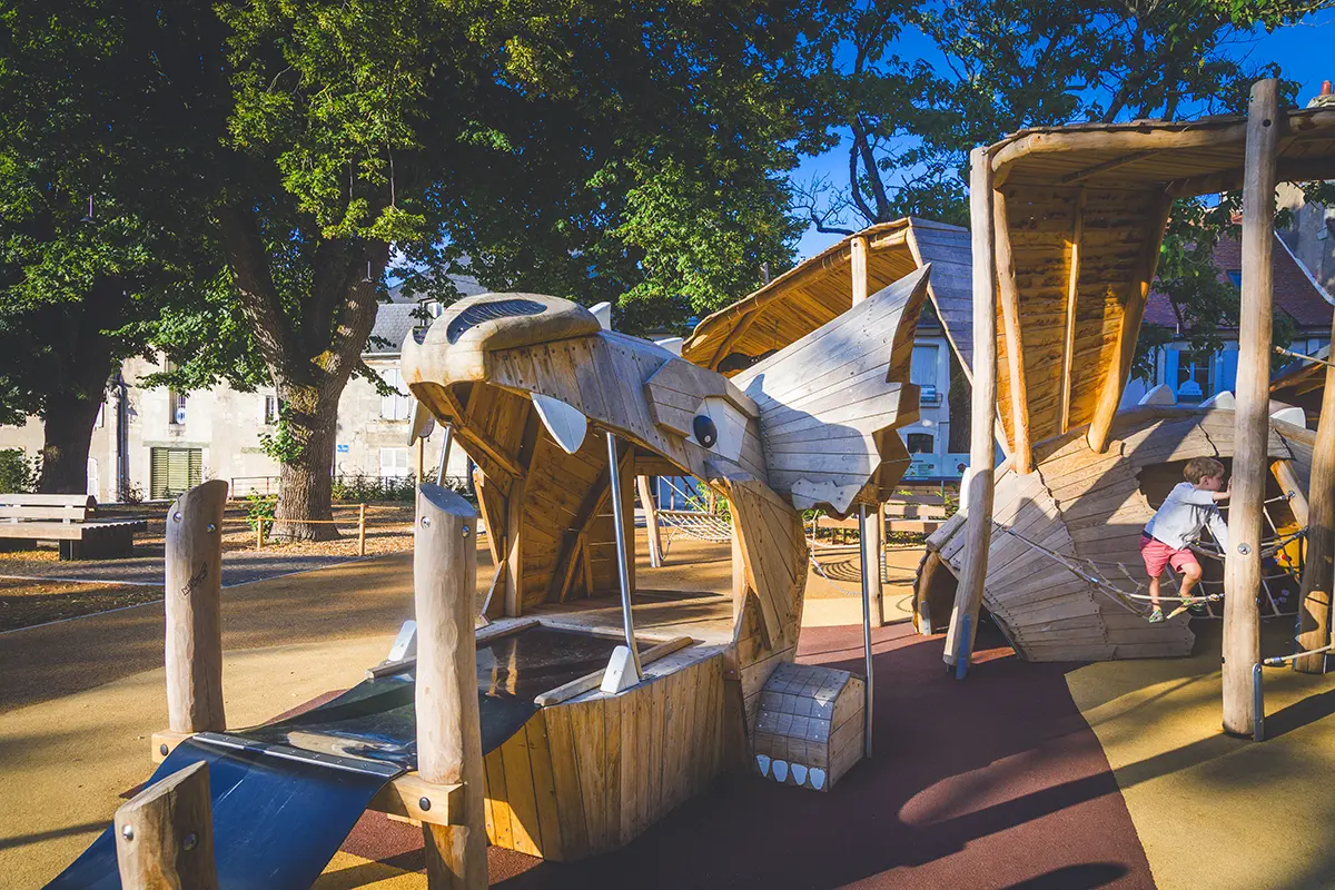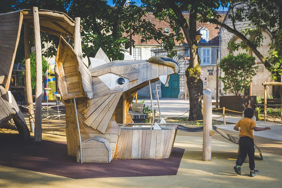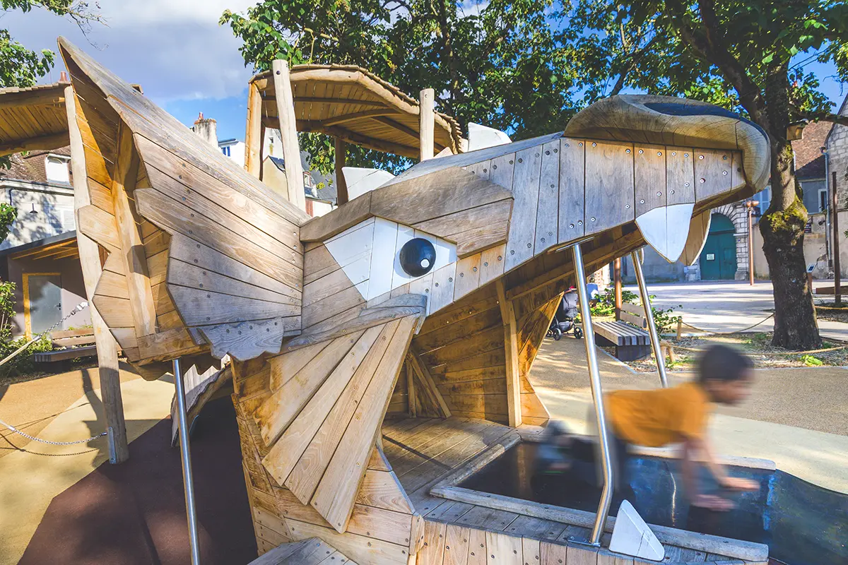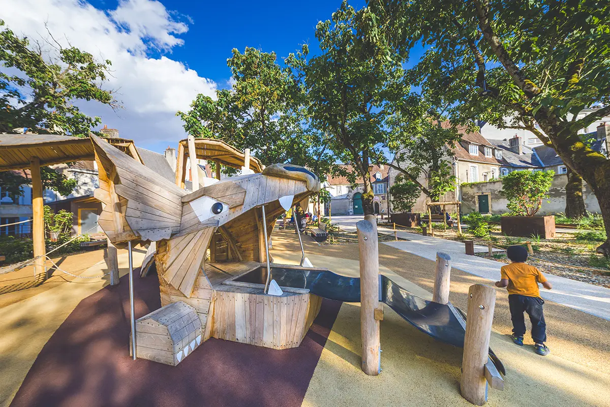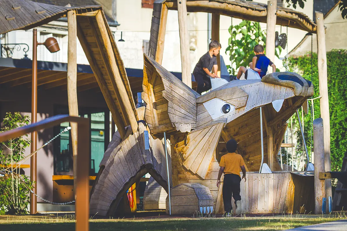 C’est dans cette dynamique que s’est inscrit le projet d’une aire de jeux thématisée, imaginée non pas comme un simple équipement isolé, mais comme une véritable expérience de ville. Un espace qui résonne avec l’identité de Bourges, qui dialogue avec son histoire, et qui crée un lien direct entre la vie des enfants d’aujourd’hui et les récits qui ont façonné la ville d’hier.