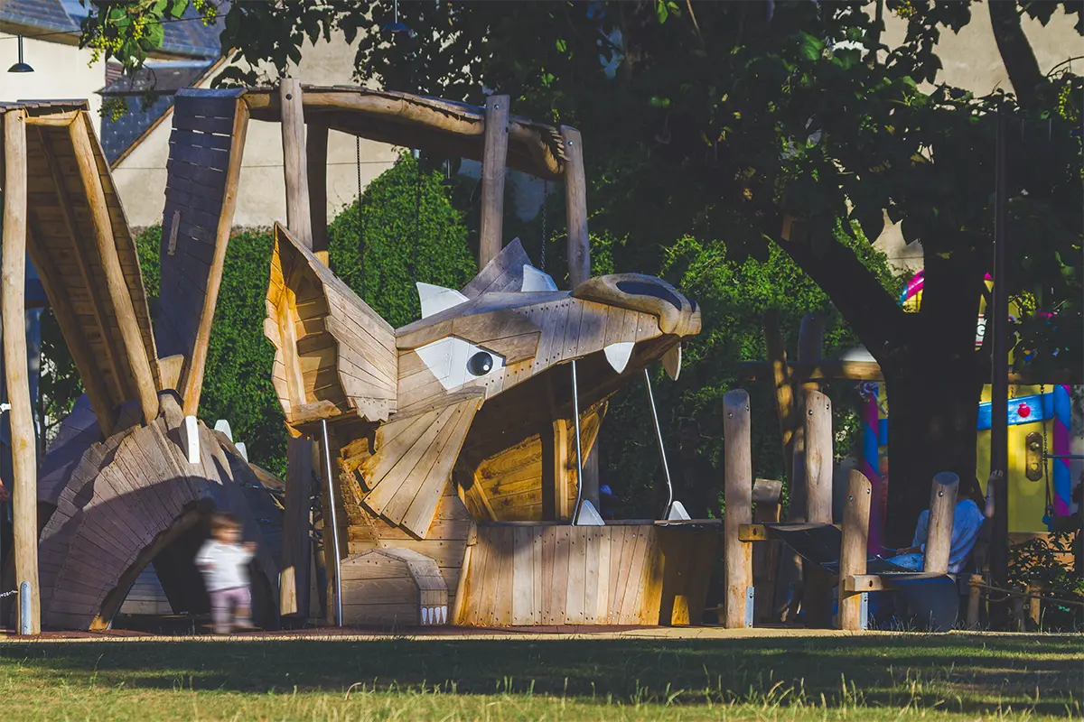 En s’inspirant de cette figure emblématique, l’aire de jeux devient un lieu où le patrimoine n’est pas seulement montré ou raconté : il est vécu. L’enfant n’est plus spectateur d’un décor historique ; il en devient acteur. Il grimpe sur les ailes d’une créature légendaire, glisse le long de son corps, s’aventure autour de ses pattes, observe la ville depuis son dos.