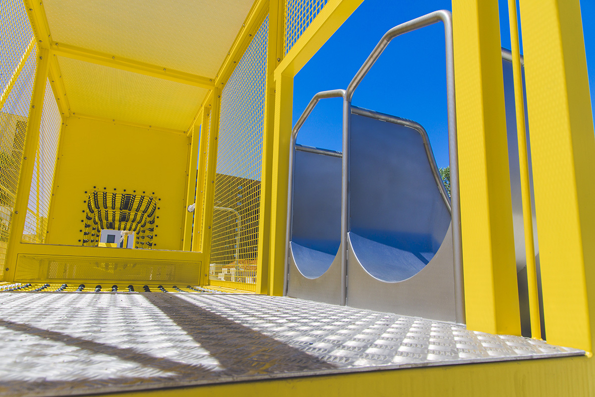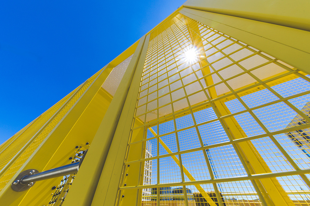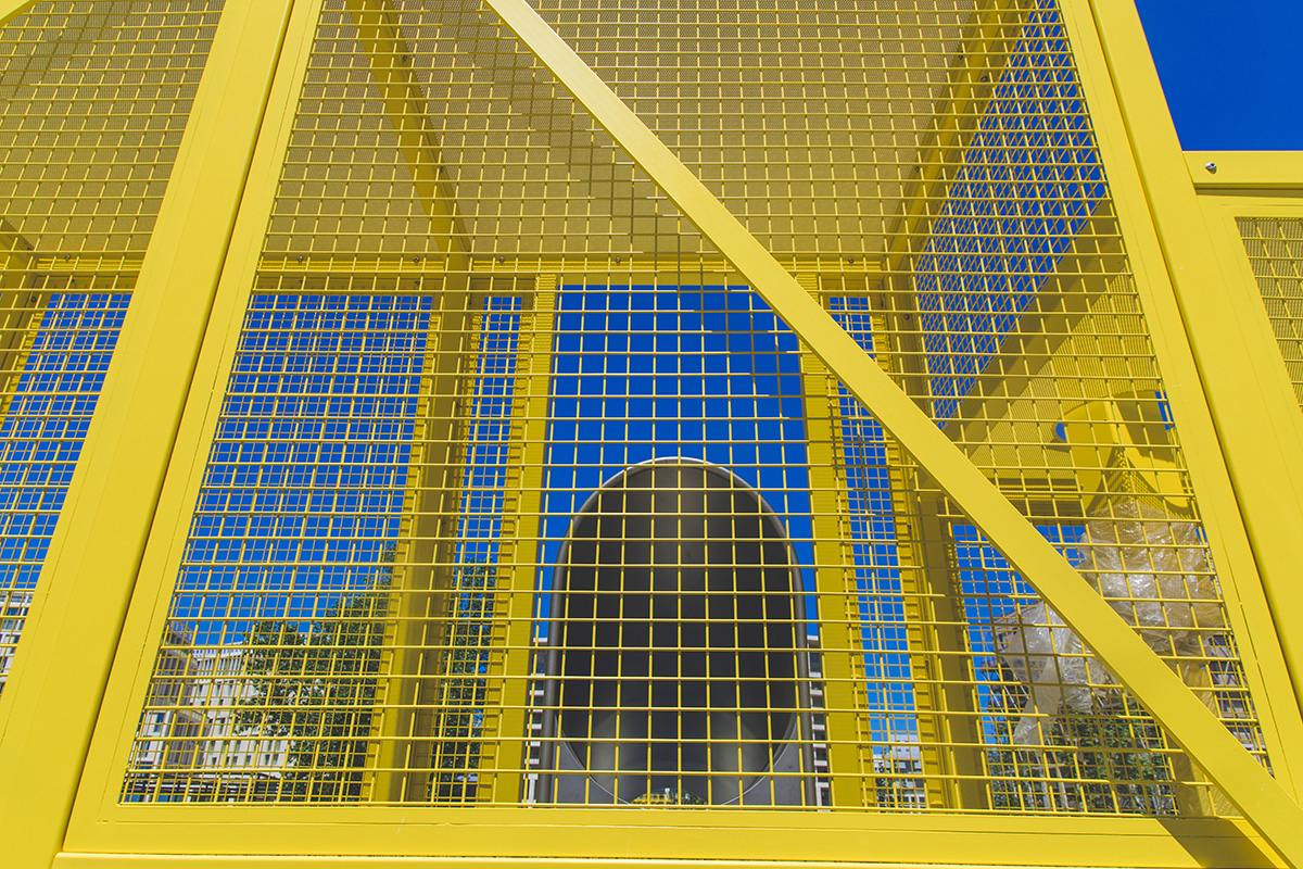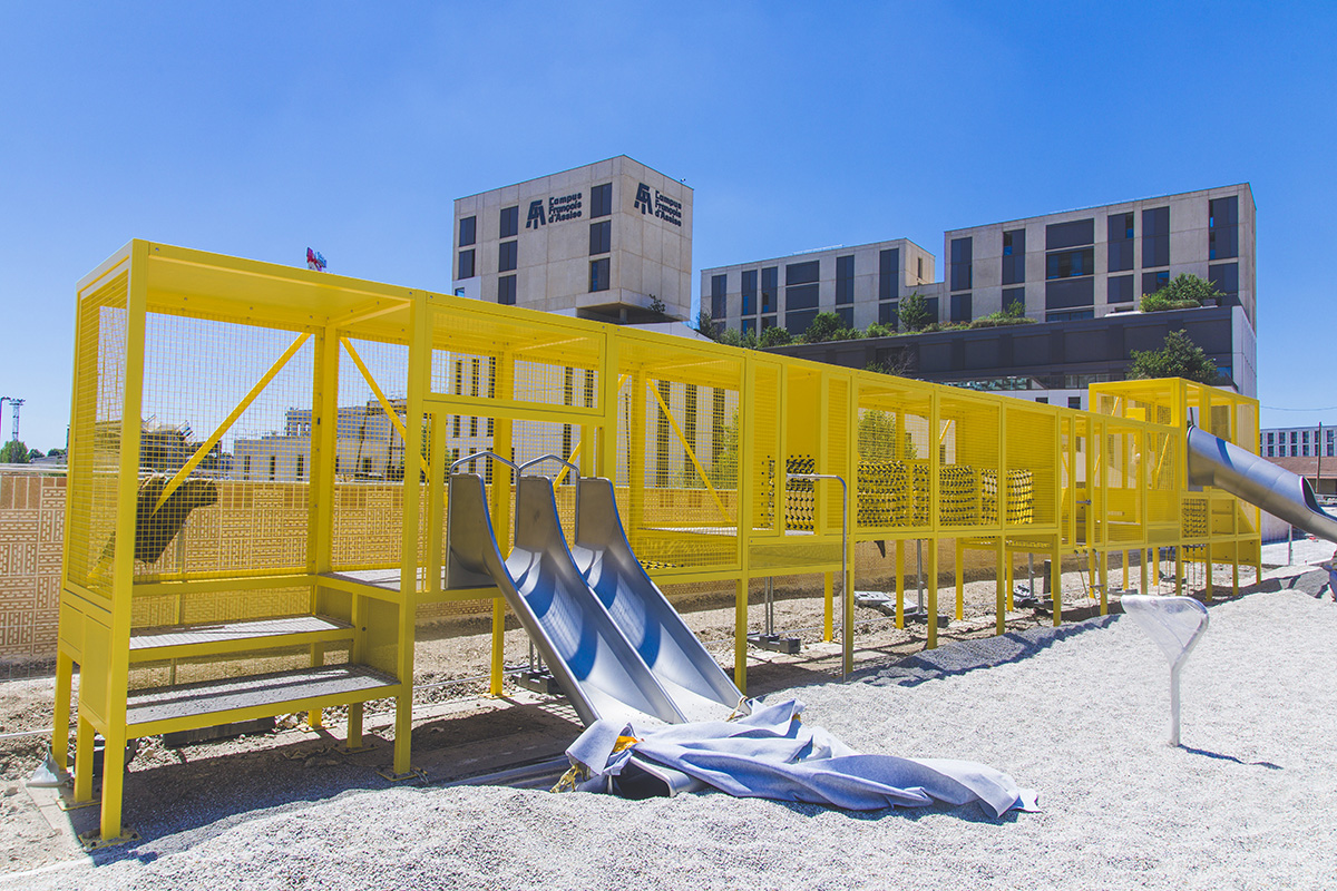 Au cœur de l’aire trône une grande structure en acier, véritable pièce maîtresse de l’aménagement. Cette structure n’a pas simplement été conçue pour être esthétique : elle incarne l’âme de l’aire de jeux et devient un repère visuel fort dans le paysage du quartier Armagnac.