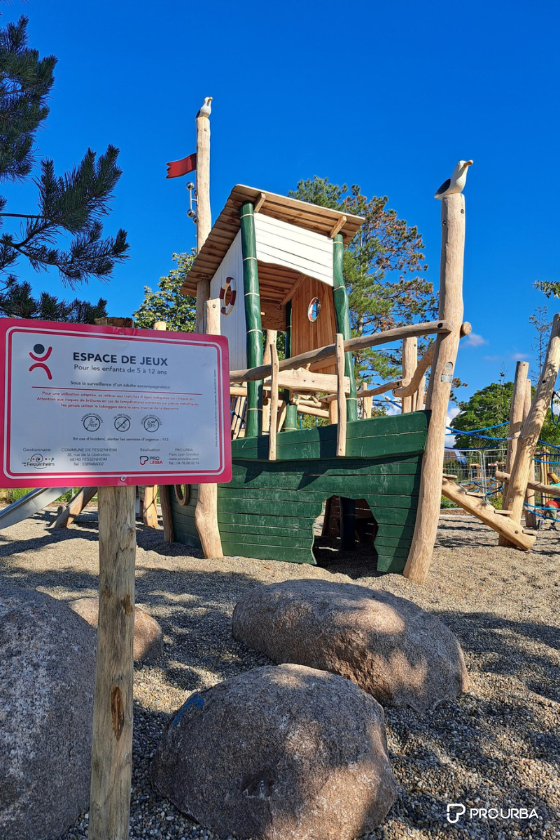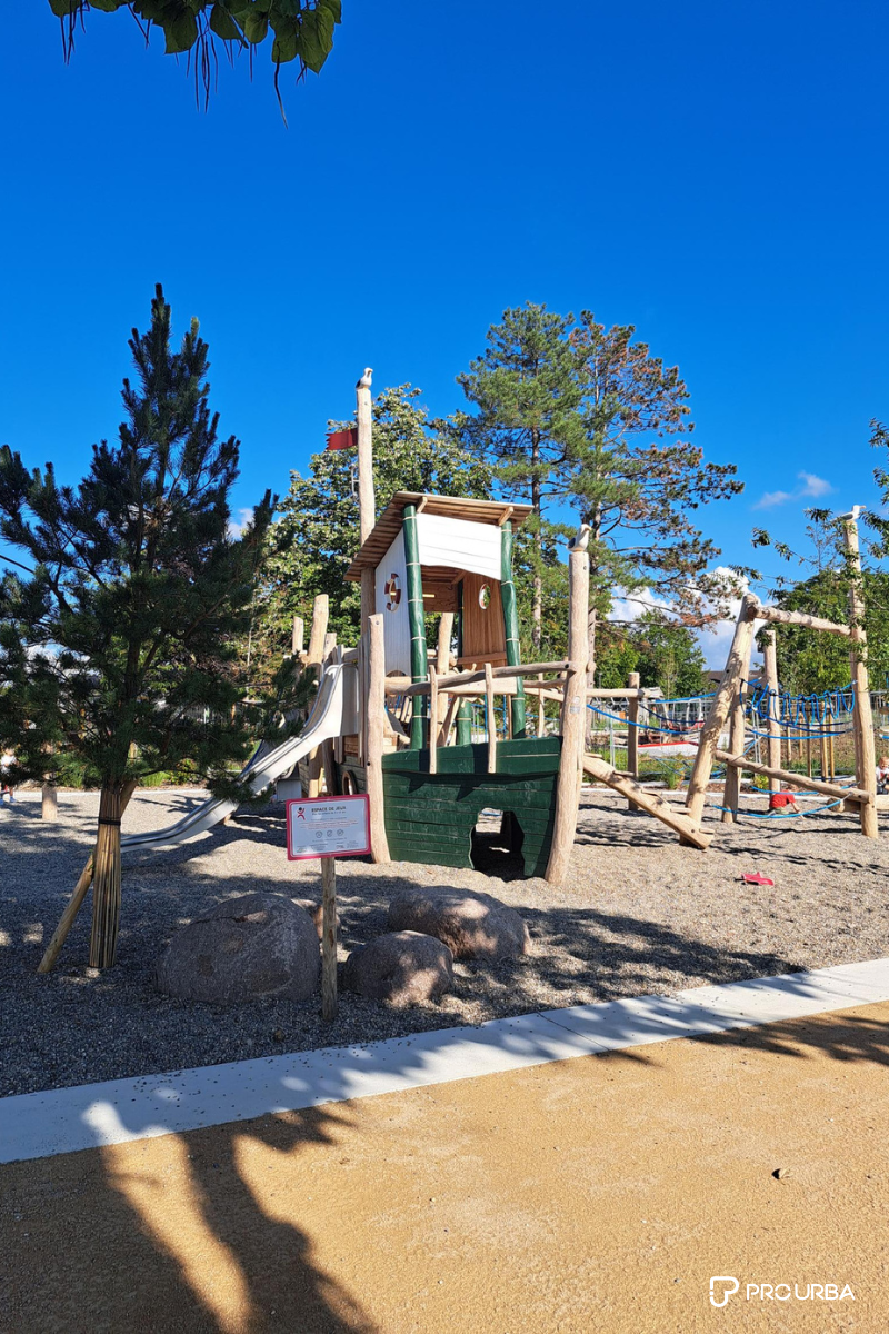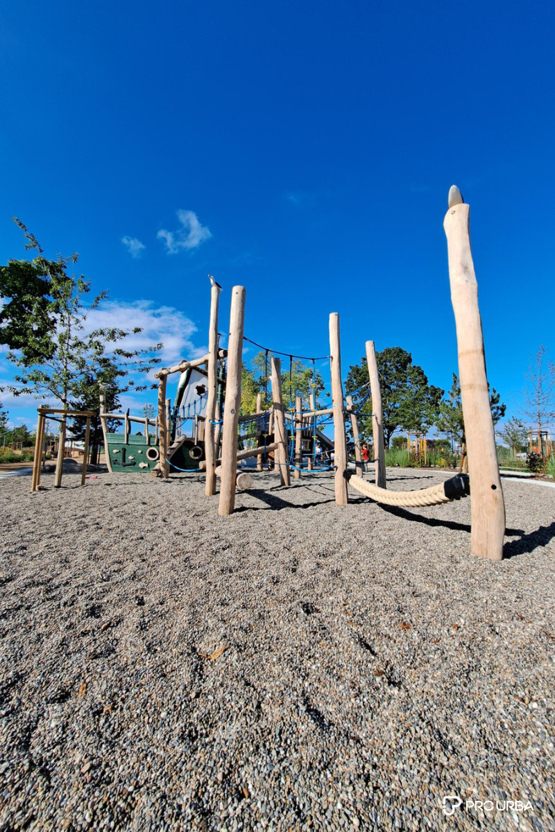 En complément des jeux d’eau, Pro Urba a développé une aire de jeux composée de structures en bois naturel favorisant l’exploration, la motricité et l’imaginaire.
