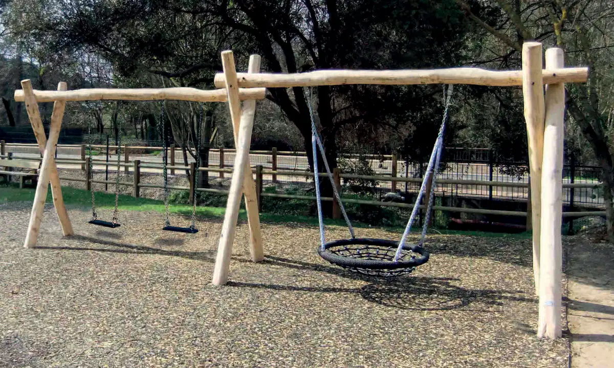 Matériaux: robinier écorcé sans aubier - cordages Hercules - sièges caoutchouc - chaînes acier inoxydable.