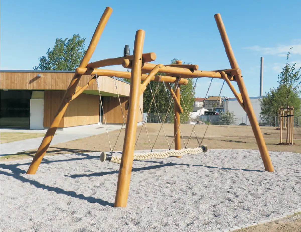 Portique collectif avec assise en corde.Matériaux: robinier écorcé sans aubier - cordages Hercules - chaînes acier inoxydable avec gaine de protectionColoris (option lasuré) : peinture à base d'eau.Assemblage : type A2 avec tiges filetées, boulonneries autobloquantes en acier inoxydable et capuchons de protection.Dimensions données à titre indicatif: le design des équipements de jeux est basé sur les formes naturelles des branches, de leurs fourches et de leurs ramifications.Construction spécifique personnalisable: tranche d'âge et hauteur de chute peuvent évoluer selon les aménagements demandésExiste également en version non teintée (réf. Q63a)