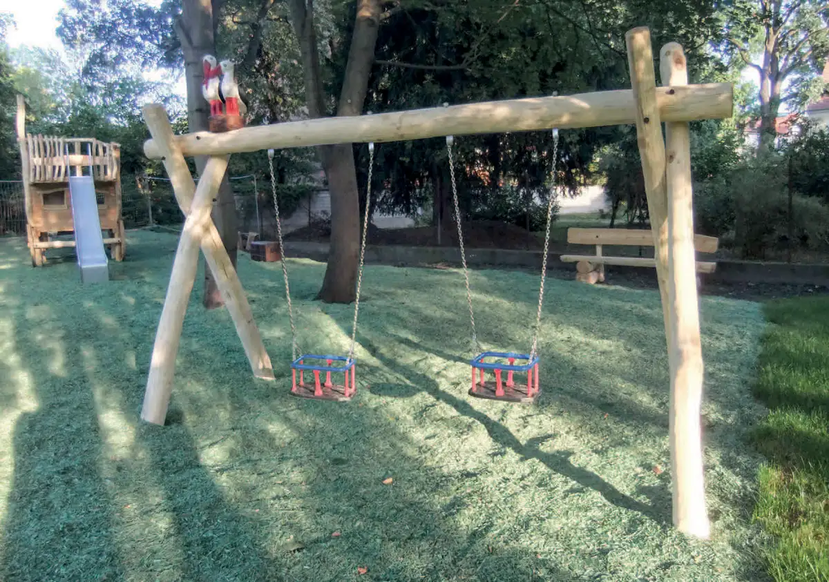 Portique 2 nacelles bébé.Matériaux: robinier écorcé sans aubier - sièges caoutchouc - chaînes acier inoxydable.Coloris (option lasuré) : peinture à base d'eau.Assemblage : type A2 avec tiges filetées, boulonneries autobloquantes en acier inoxydable et capuchons de protection.Dimensions données à titre indicatif: le design des équipements de jeux est basé sur les formes naturelles des branches, de leurs fourches et de leurs ramifications.Construction spécifique personnalisable: tranche d'âge et hauteur de chute peuvent évoluer selon les aménagements demandés