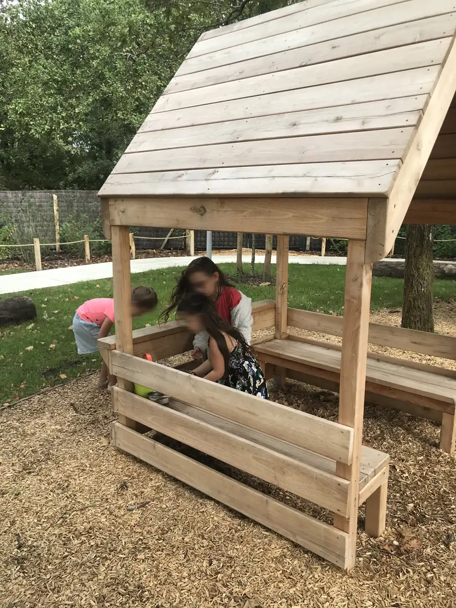 Mobilier ludique avec toit plein et périphérie ajourée.Comprend 2 bancs intérieurs et étagères.Hors bacs en plastique.Montage et assemblage en atelier.