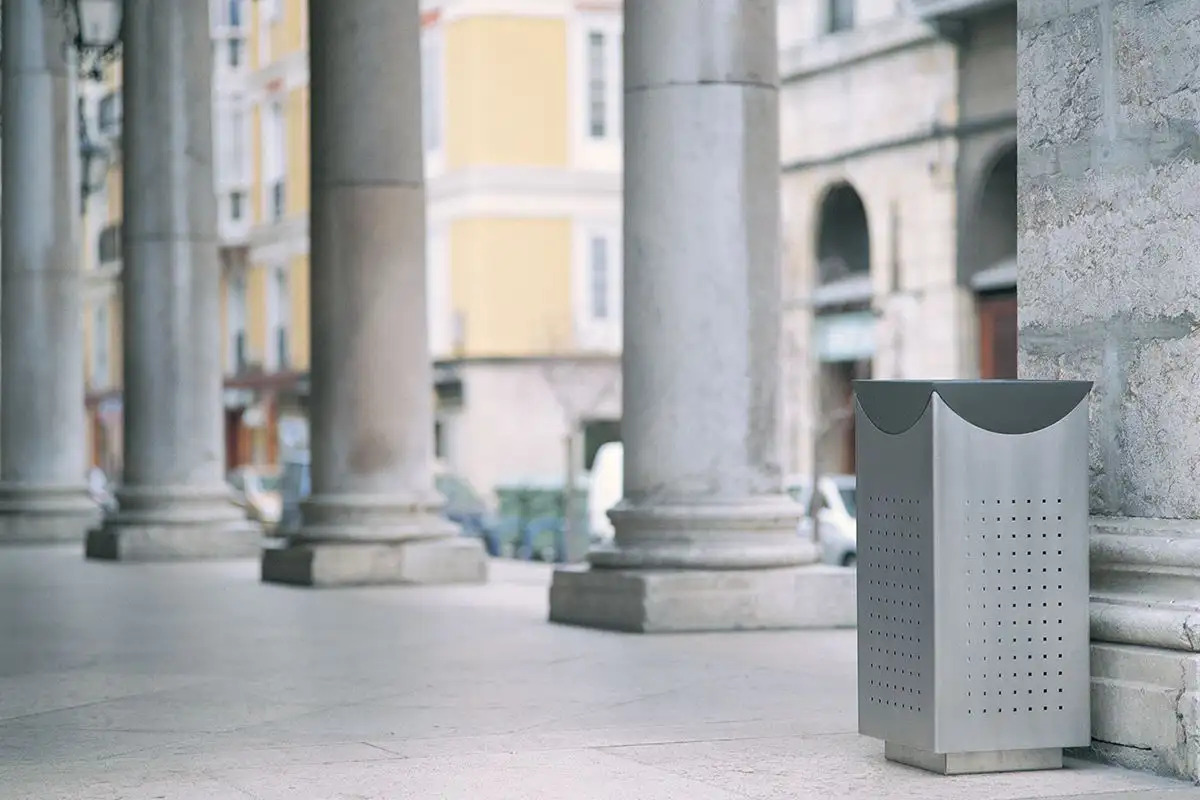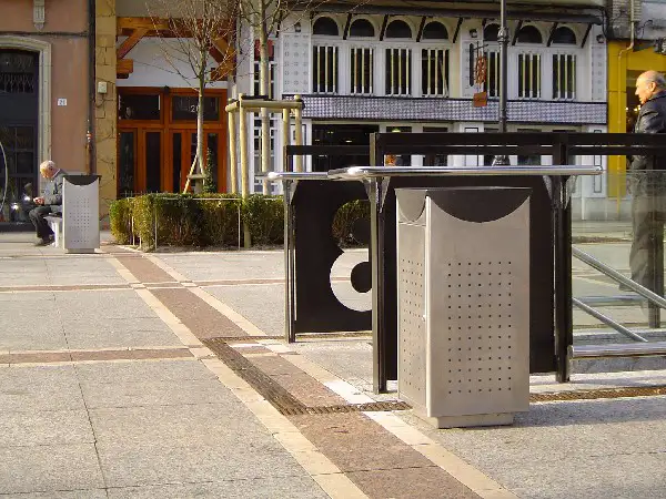 Corbeille urbaine avec cendrier intégré, LIPS est disponible en deux versions : acier pour les environnements difficiles ou bois pour les aménagements plus rustiques.