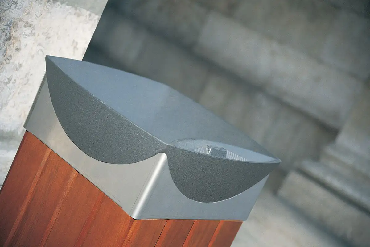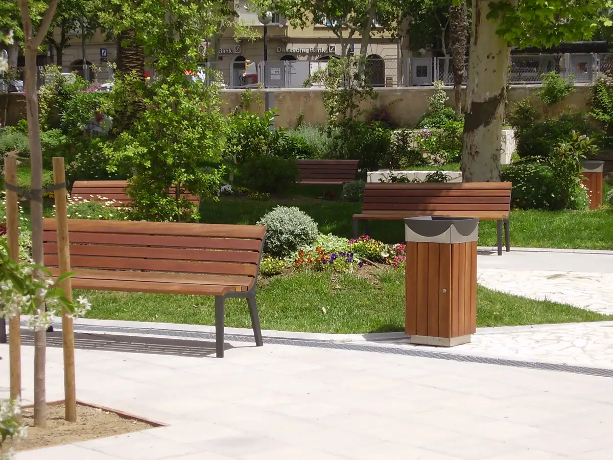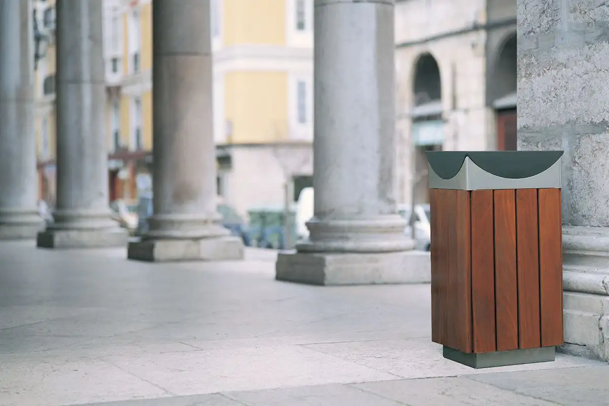 Corbeille urbaine avec cendrier intégré, LIPS est disponible en deux versions : acier pour les environnements difficiles ou bois pour les aménagements plus rustiques.Également disponible avec couvercle.
