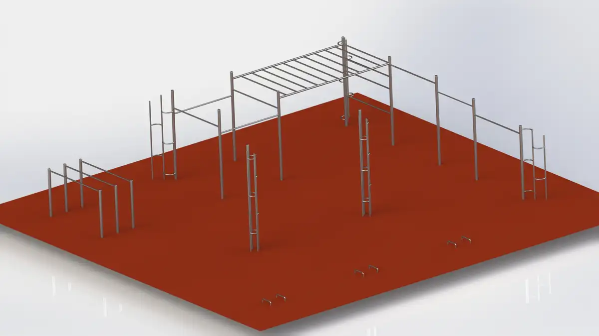 Parcours sportif composé de :- barre de traction triple avec poteau vague (réf. BA01-V)- carré de traction avec poteau vague (réf. BA02V-1)- échelle inversée avec poteau vague (réf. BA04V-2)- barre parallèle double (réf. BA03)- 2 poteaux anneaux(réf. BA06-1 et BA06-2)- crochets de pompes (3 paires) (réf. BA07)Conception PRO URBAFabriqué en France