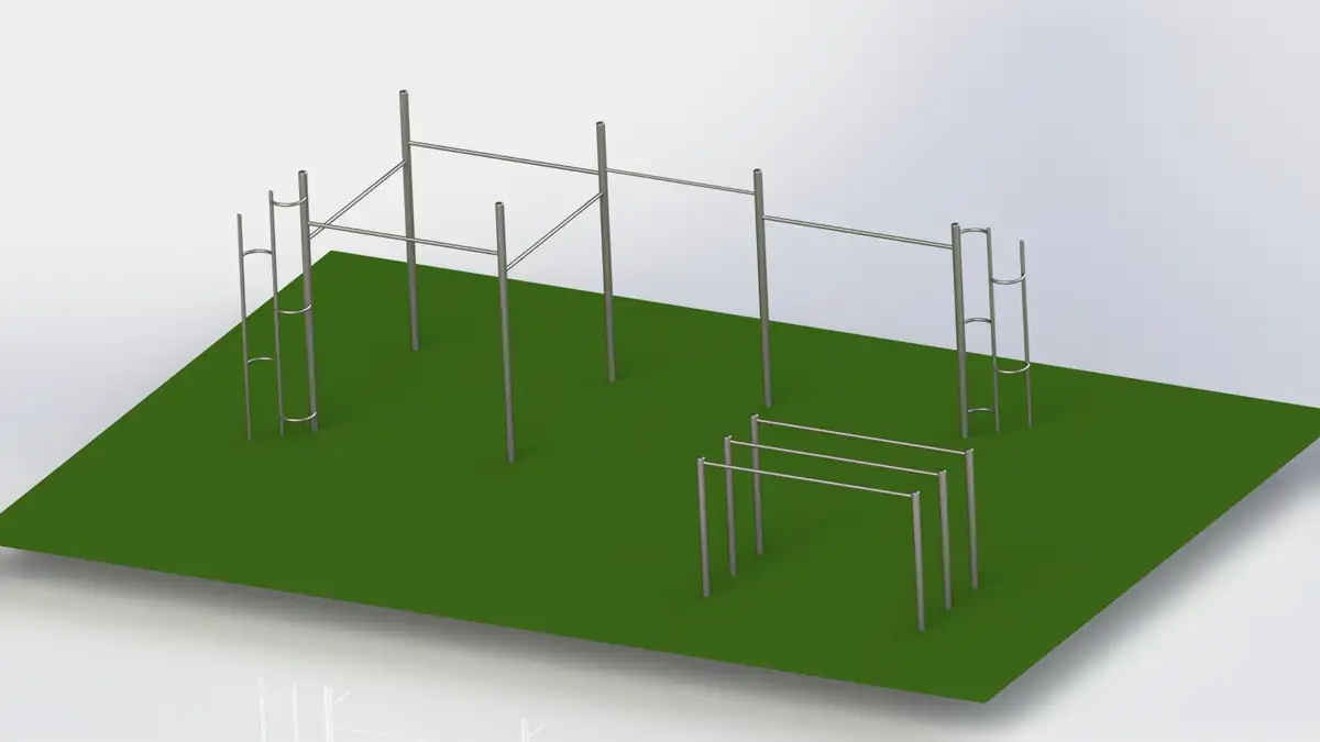 Parcours sportif composé de :- barre de traction triple avec poteau vague (réf. BA01-V)- carré de traction avec poteau vague (réf. BA02V-2)- barre parallèle double (réf. BA03)Conception PRO URBAFabriqué en France