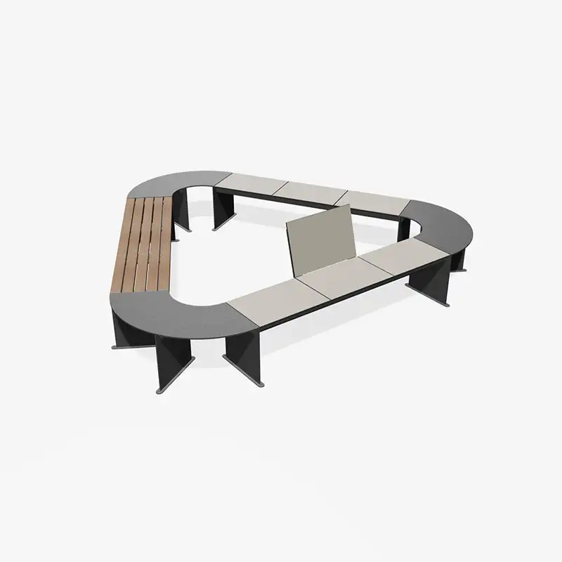 Droite, rectangulaire, triangulaire, elliptique ou complètement non conventionnelle, la gamme modulaire GO permet de réaliser à peu près tout ce que l'on peut imaginer.Le design est volontairement simple. Ainsi, même les formes les plus complexes ont l'air accrocheuses et cohérentes. Le configurateur permet d'essayer différentes formes et de choisir entre les différents éléments de construction : banc avec dossier ou sans dossier, avec petite table ou sans table, surfaces en stratifié haute pression.