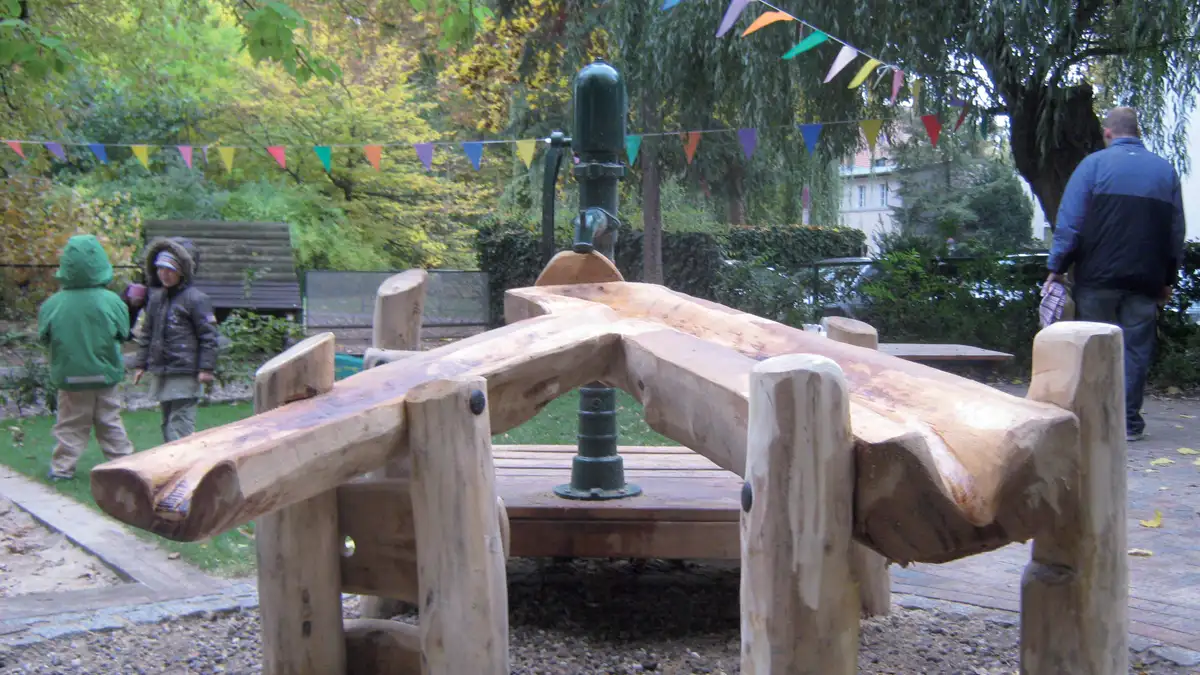 Équipement ludique de manipulation pour espace de jeux d'eau et sable.