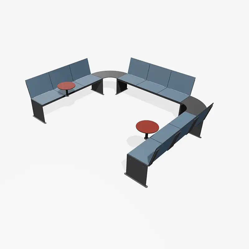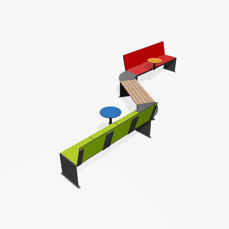 Droite, rectangulaire, triangulaire, elliptique ou complètement non conventionnelle, la gamme modulaire GO permet de réaliser à peu près tout ce que l'on peut imaginer.Le design est volontairement simple. Ainsi, même les formes les plus complexes ont l'air accrocheuses et cohérentes. Le configurateur permet d'essayer différentes formes et de choisir entre les différents éléments de construction : banc avec dossier ou sans dossier, avec petite table ou sans table, surfaces en bois ou HPL!