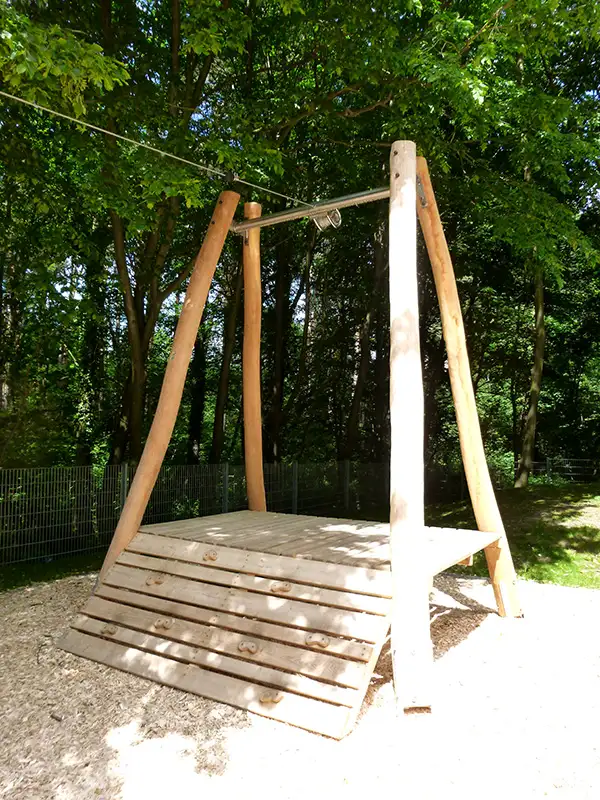 Téléphérique simple avec siège pendulaire.Traverses en acier inoxydable.Longueur de traversée 20m.Matériaux: robinier écorcé sans aubier - acier inoxydable - siège caoutchouc.Coloris (option lasuré) : peinture à base d'eau.Assemblage : type A2 avec tiges filetées, boulonneries autobloquantes en acier inoxydable et capuchons de protection.Dimensions données à titre indicatif: le design des équipements de jeux est basé sur les formes naturelles des branches, de leurs fourches et de leurs ramifications.Construction spécifique personnalisable: tranche d'âge et hauteur de chute peuvent évoluer selon les aménagements demandés.Également disponible sans rampe de départ.