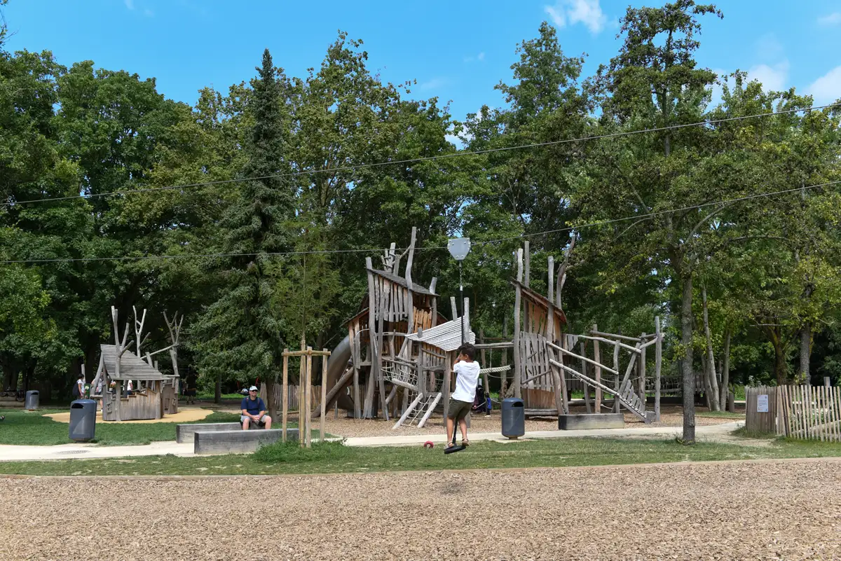 Téléphérique double avec sièges pendulaires, sans rampe de départ - Butte à réaliser sur site.Longueur de traversée 20m.Matériaux: robinier écorcé sans aubier - sièges caoutchouc.Coloris (option lasuré) : peinture à base d'eau.Assemblage : type A2 avec tiges filetées, boulonneries autobloquantes en acier inoxydable et capuchons de protection.Dimensions données à titre indicatif: le design des équipements de jeux est basé sur les formes naturelles des branches, de leurs fourches et de leurs ramifications.Construction spécifique personnalisable: tranche d'âge et hauteur de chute peuvent évoluer selon les aménagements demandés.Également disponible avec rampe de départ ou en version simple.